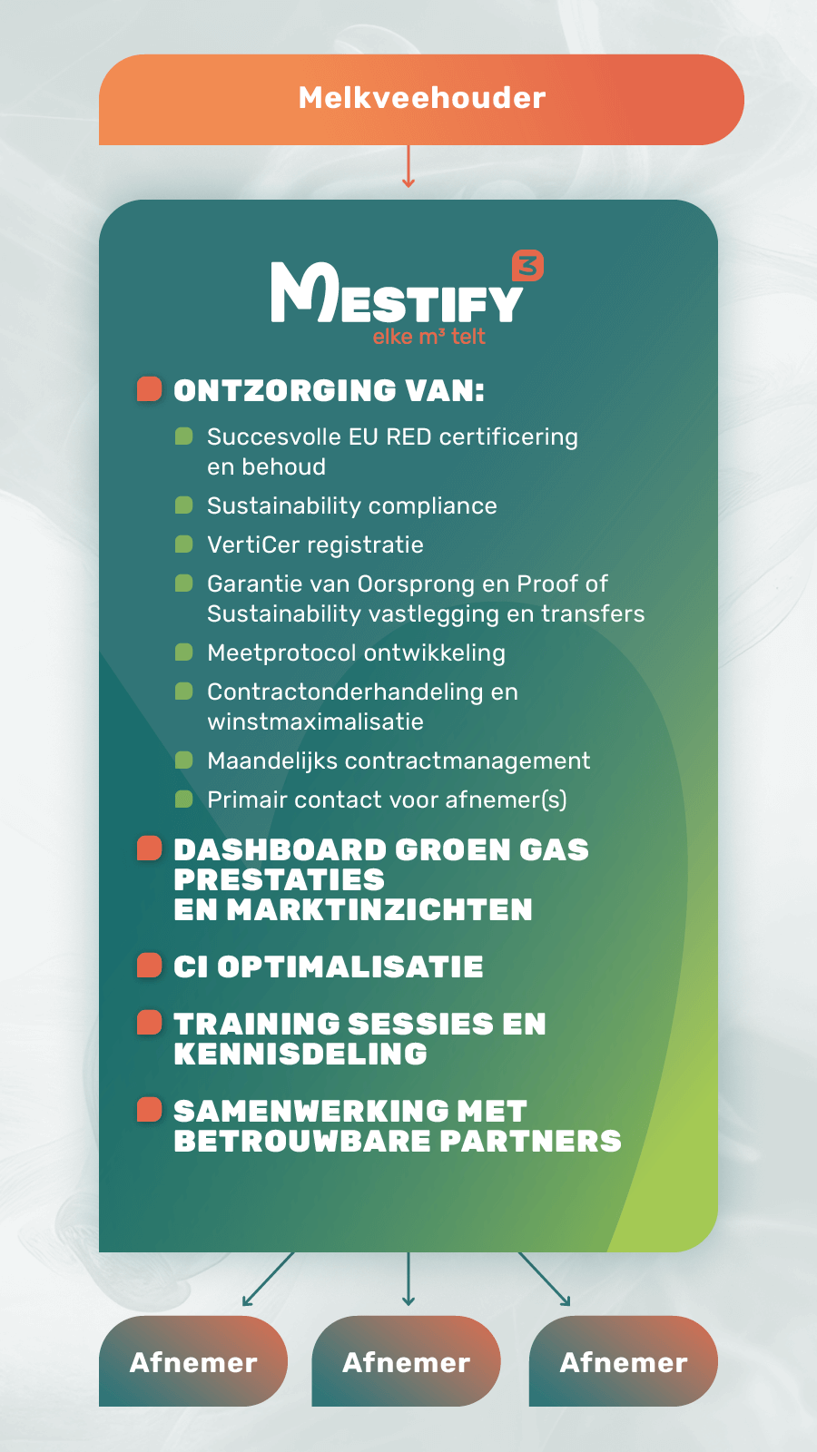 Met MESTIFY helpen we je om het meeste uit iedere kuub mest te halen met monomestvergisting. Met onze expertise in EU RED-certificering zorgen we ervoor dat je eenvoudig groen gas kunt verkopen tegen de beste prijs. Ons digitale platform begeleidt je door het hele proces van certificering en helpt je om alle eisen te voldoen. Het platform biedt je daarnaast de optie om te profiteren van gunstige contracten die wij voor je uitonderhandelen. Zo kun jij optimaal gebruik maken van je tijd en middelen.